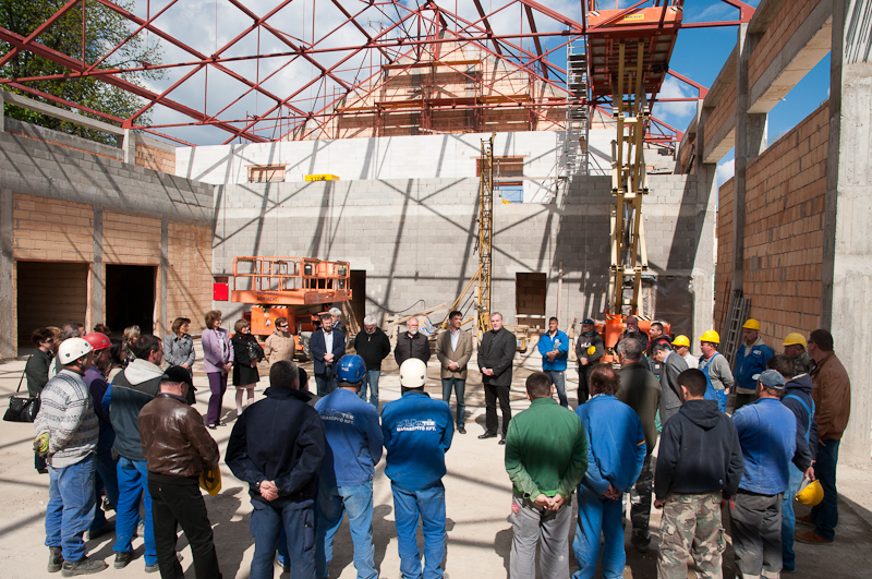 Az épület bejárását követően, amely során Kiss Zsolt építésvezető kalauzolta végig a meghívottakat a leendő csarnok legfontosabb pontjain, sor került az avatásra: felkerült a szalagokkal feldíszített bokréta a tető legmagasabb pontjára, valamint jófajta balatoni vörösborral locsolták meg a kész tűzfalat. Ezeket az ünnepélyes és örömteli pillanatokat tette teljesebbé Csernyánszky Elek (ALP-Inter Kft., ügyvezető) üdvözlő beszéde, valamint Filó Kristóf kanonok úr hálaadó szavai, aki a Teremtő áldását kérte az építőmunkásokra. Török Csaba igazgató úr, a házigazda jogával élve büszkén mutatta a meghívottaknak az eddigi eredményeket, és köszönetét fejezte ki a kivitelezőnek és a dolgozóknak pontos és lelkiismeretes munkájukért. Természetesen a lakoma sem maradhatott el; Csernyánszky úrnak köszönhetően kiváló ebédnek örülhettünk; finom és omlós marhapörköltnek tarhonyával és savanyúsággal. Joggal csettinthetett minden jelenlévő és sajnálhatta, hogy csak az épületet locsolták veresborral?